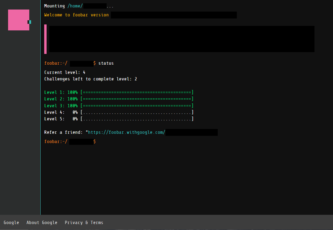 이 채용 절차의 공식 명칭은 "Google Foo Bar" 입니다. "Foobar Challenge"로도 많이 불립니다. 구글 검색 기록을 바탕으로, 구글이 원하는 유형의 사람이라고 내부적으로 판단하게되면 구글 화면이 갈라지면서 아래와 같은 방식으로 시작됩니다. 이 챌린지를 진행하다보면 지인을 추천할 수 있는 초대장을 주는데, 이 추천 코드를 통해서도 접근할 수 있게 됩니다. 아쉽게도 제가 직접 구글의 간택을 받은 것은 아니고, 지인의 추천 코드를 통해 접근권한을 얻었습니다.